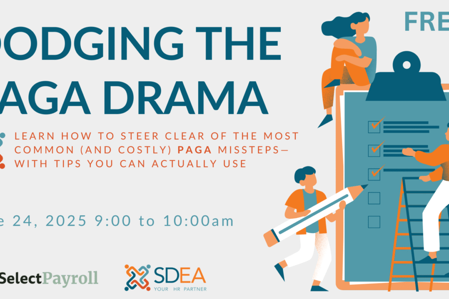 HR Blog What You Need to Know About PAGA Claims: Avoiding a Costly Mistake6.11.25 By Jennifer Jacobus, PHRca, SDEA CEO If you’re an HR professional or a small business owner…SDEAJune 11, 2025